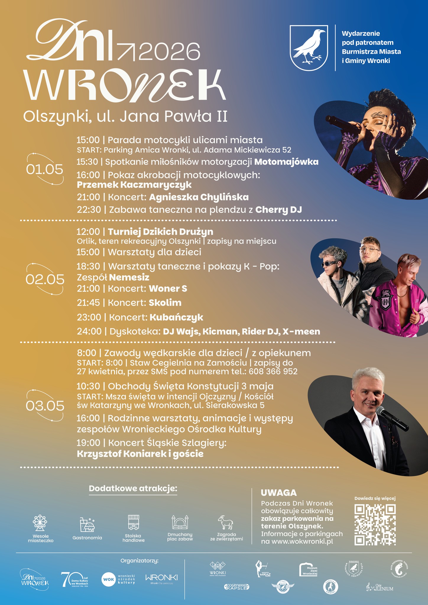 W dniach od 1 do 3 maja 2026 roku odbędą się Dni Wronek – jedno z największych wydarzeń plenerowych w regionie. Impreza zaplanowana została na terenie Olszynek przy ul. Jana Pawła II i odbywa się pod patronatem Burmistrza Miasta i Gminy Wronki.