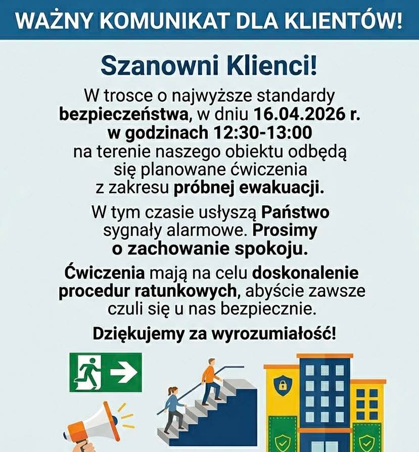 Próbna ewakuacja ma na celu doskonalenie procedur ratunkowych oraz sprawdzenie gotowości pracowników i użytkowników obiektu w sytuacjach kryzysowych.