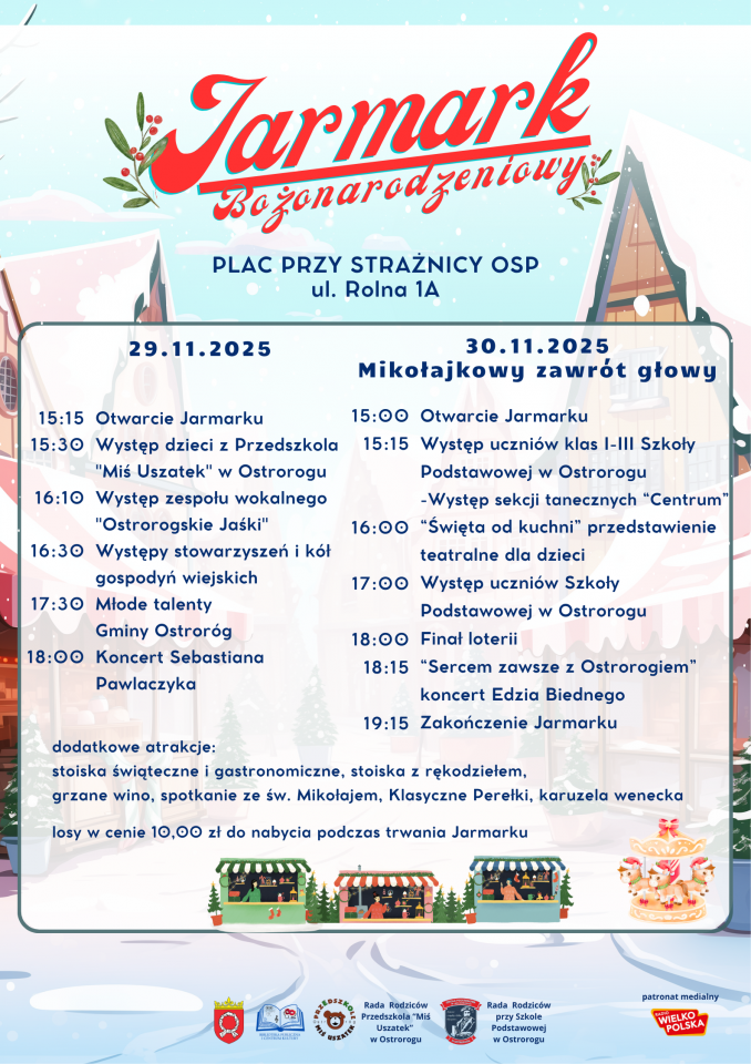 Już pod koniec listopada Ostroróg ponownie wypełni się świąteczną atmosferą. Na placu przy strażnicy OSP przy ul. Rolnej 1A odbędzie się tegoroczny Jarmark Bożonarodzeniowy, zaplanowany na 29 i 30 listopada 2025 roku. Organizatorzy przygotowali pełen atrakcji program, w którym znajdą się koncerty, występy dzieci, prezentacje lokalnych stowarzyszeń oraz spotkanie ze świętym Mikołajem.