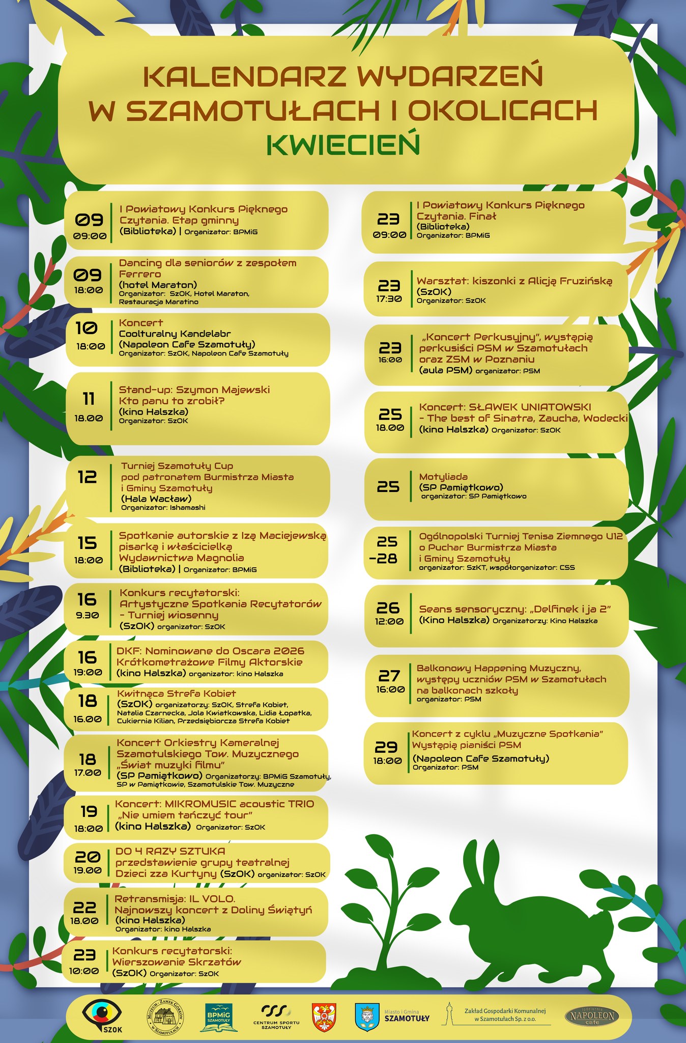 Kwiecień 2026 roku w Szamotułach zapowiada się wyjątkowo intensywnie. Mieszkańcy oraz goście mogą liczyć na bogaty program wydarzeń kulturalnych, sportowych i edukacyjnych. W kalendarzu znalazły się koncerty, warsztaty, spotkania autorskie, konkursy oraz wydarzenia skierowane do różnych grup wiekowych.