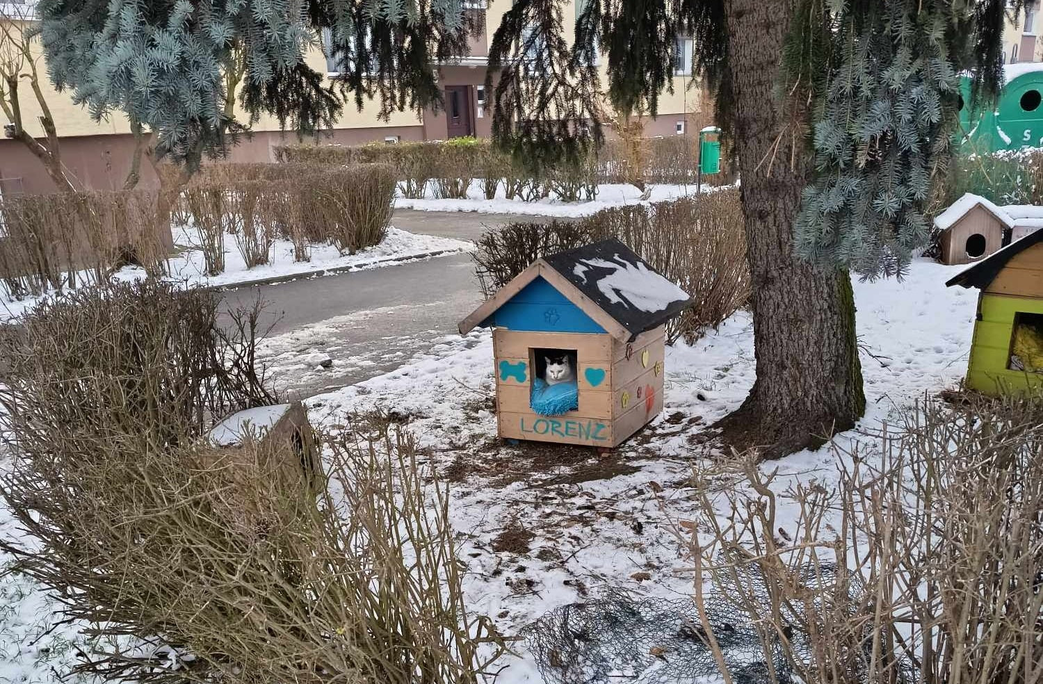 Na osiedlu pojawiły się specjalne budki dla kotów, przystosowane do zimowych warunków. Choć ich rozmiary mogą sugerować coś innego, każda budka została zaprojektowana z myślą o jednym zwierzęciu. Wnętrza są wyłożone grubym styropianem i wyposażone w ciepłe posłania, co chroni koty przed niskimi temperaturami, wiatrem i wilgocią.