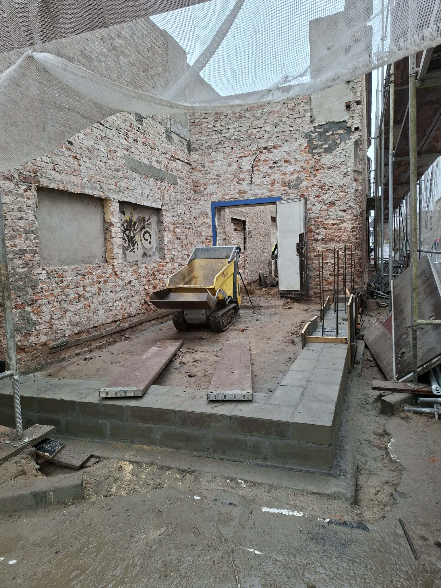 Trwają również intensywne prace przy przebudowie dawnej synagogi, w której powstaje nowy Dom Kultury. Wzmocniono fundamenty budynku, a równolegle prowadzone jest wznoszenie ścian działowych. Rozpoczęto też odtwarzanie północno-wschodniego narożnika, gdzie znajdzie się niewielka przebieralnia oraz zaplecze sceny.