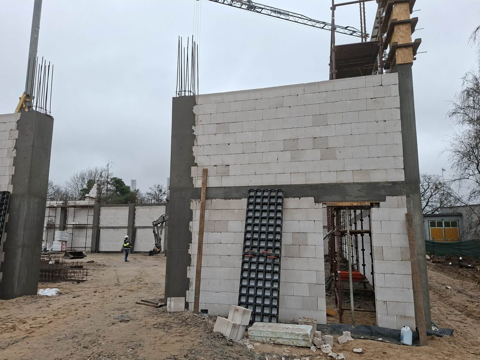 Realizacja nowej hali sportowej przebiega zgodnie z harmonogramem. Konstrukcja głównej części obiektu systematycznie rośnie, a ściana południowa niemal osiągnęła docelową wysokość. Na wykonanych żelbetowych słupach opierać się będzie więźba dachowa, która nada obiektowi ostateczny kształt.