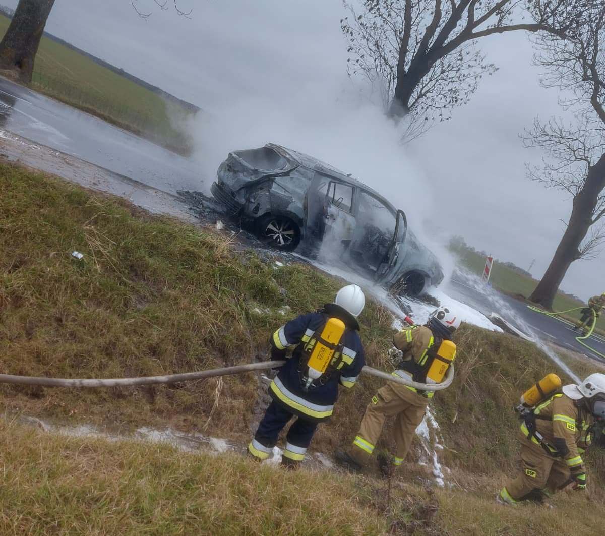 W niedzielę, 15 marca 2026 roku o godzinie 12:01 do dyżurnego Stanowiska Kierowania Państwowej Straży Pożarnej w Szamotułach wpłynęło zgłoszenie o pożarze pojazdu elektrycznego. Informacja została przekazana przez Centrum Powiadamiania Ratunkowego. Do zdarzenia doszło na drodze wojewódzkiej nr 116 w miejscowości Karmin w gminie Pniewy.
