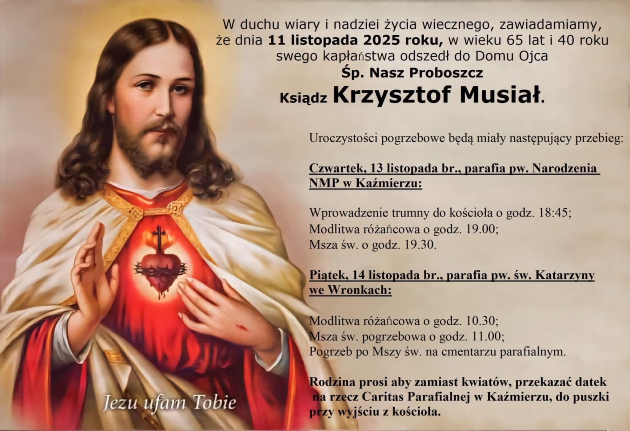Parafia zawiadamia, że uroczystości pogrzebowe śp. księdza Krzysztofa Musiała odbędą się w następującym porządku: