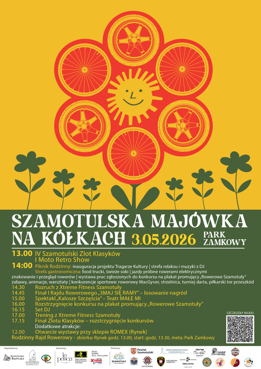 Szamotulski Ośrodek Kultury opublikował dziś program Szamotulskiej Majówki na kółkach 2026. Wydarzenie odbędzie się w niedzielę, 3 maja w Parku Zamkowym.