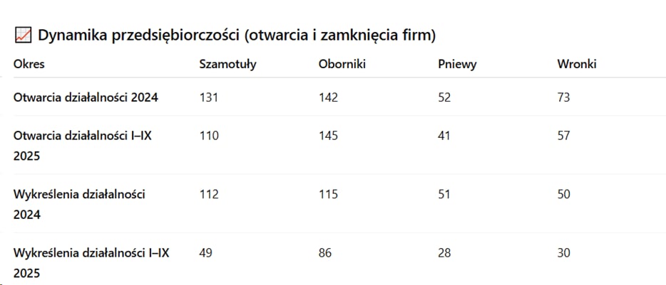 W Pniewach zarejestrowano 41 nowych działalności, przy 28 wykreśleniach, a we Wronkach – 57 nowych i 30 zamkniętych firm. Dane wskazują więc, że w mniejszych gminach przedsiębiorczość rozwija się stabilnie, natomiast w Obornikach, mimo dużej liczby otwarć, widoczna jest także wysoka rotacja podmiotów.