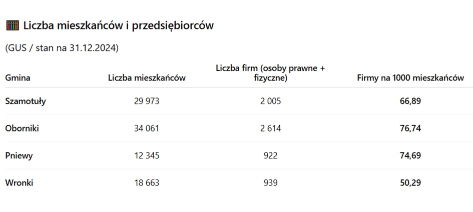 Zestawienie opracowano na podstawie informacji przekazanych przez urzędy gmin Szamotuły, Oborniki, Pniewy i Wronki (stan na 5 listopada 2025 r.) oraz danych Głównego Urzędu Statystycznego dotyczących liczby mieszkańców (stan na 31 grudnia 2024 r.).