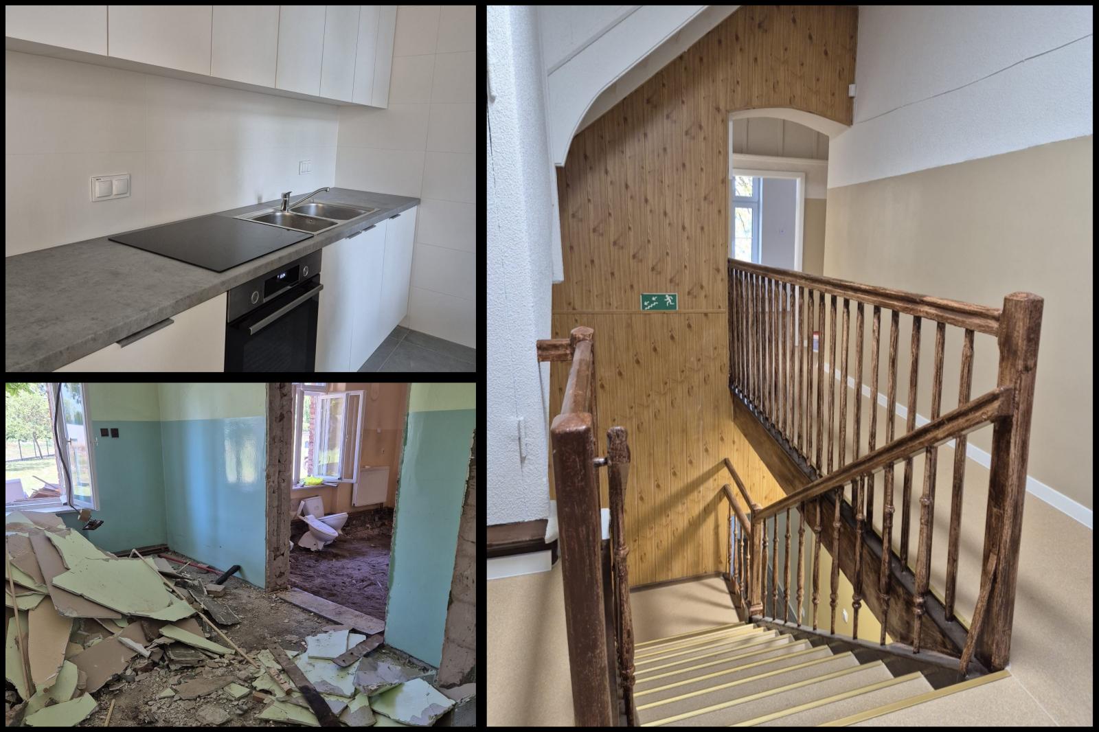 Zakres robót był szeroki i obejmował wymianę stolarki okiennej, posadzek oraz instalacji wodno-kanalizacyjnej, sanitarnej i elektrycznej. Na parterze zmieniono i przebudowano układ pomieszczeń. Ściany zostały wyszpachlowane i pomalowane, położono nowe podłogi, zamontowano oświetlenie, drzwi zewnętrzne i częściowo również drzwi wewnętrzne. Odnowiono także schody prowadzące na piętro.