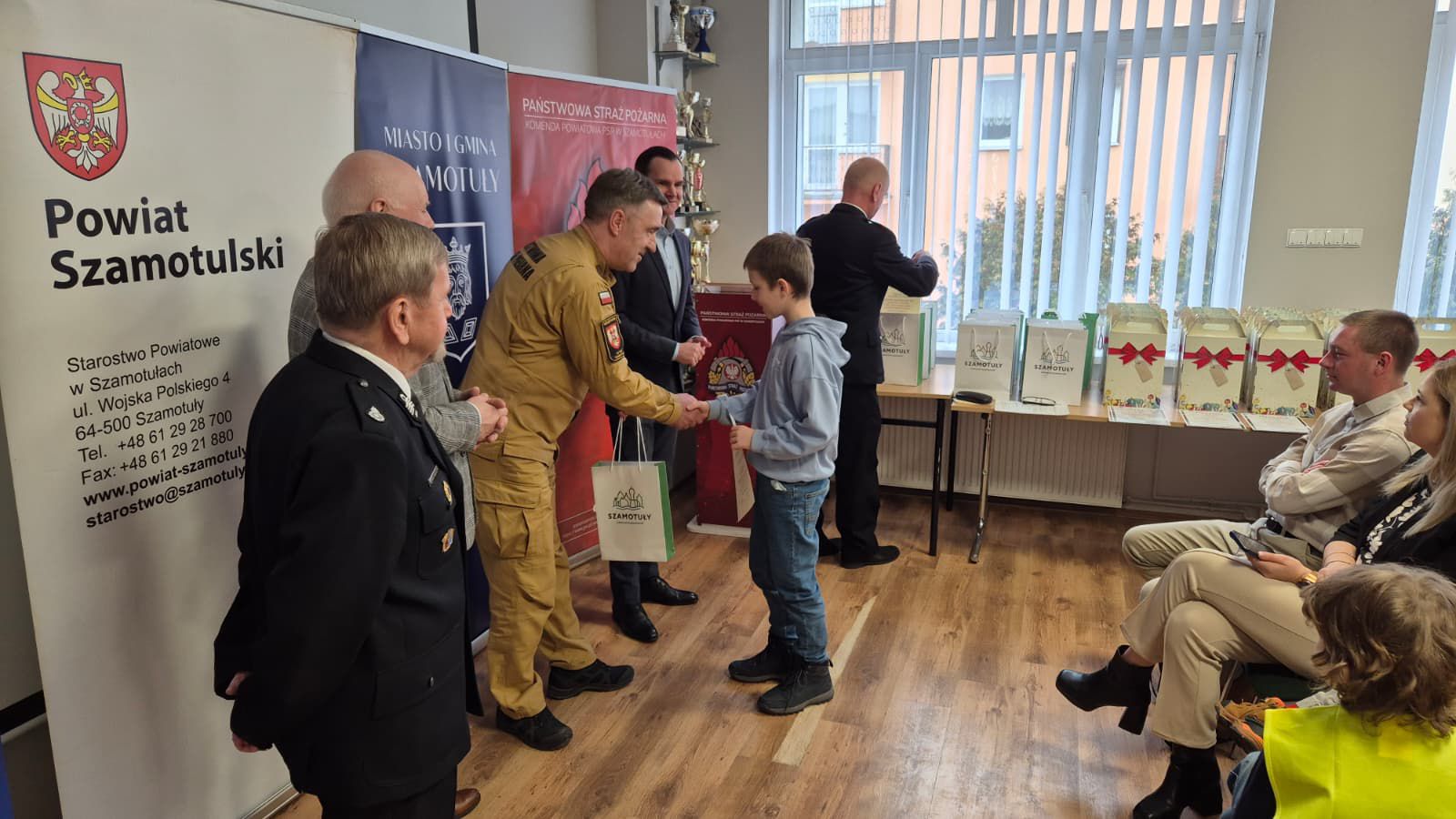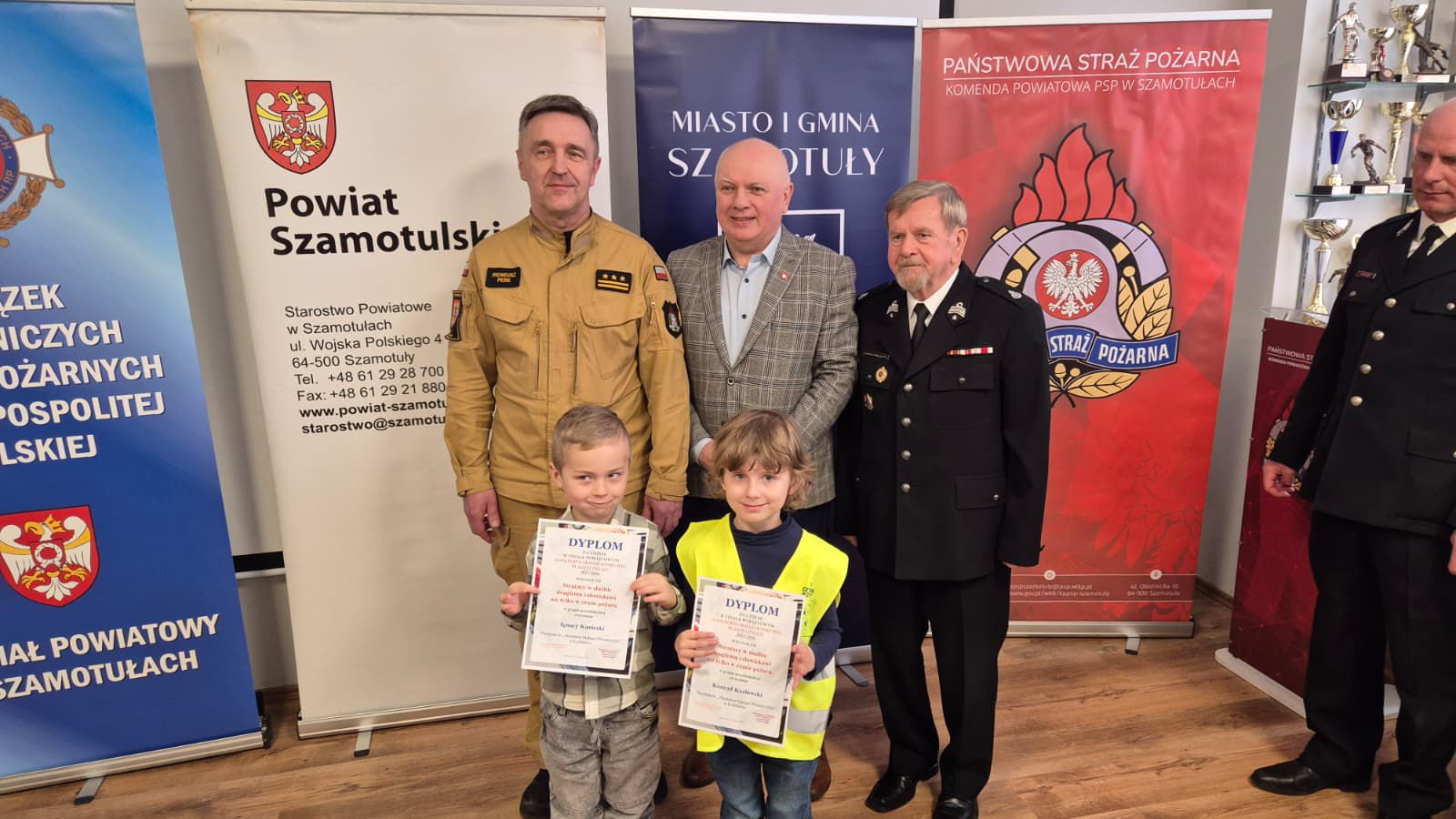 Nagrody rzeczowe laureatom przekazali: Wicestarosta Szamotulski Przemysław Nowak, Burmistrz Miasta i Gminy Szamotuły Piotr Michalak, Komendant Powiatowy Państwowej Straży Pożarnej w Szamotułach st. bryg. Ireneusz Pers oraz Prezes Zarządu Oddziału Powiatowego Związku Ochotniczych Straży Pożarnych RP w Szamotułach dh Zenon Pawlaczyk.