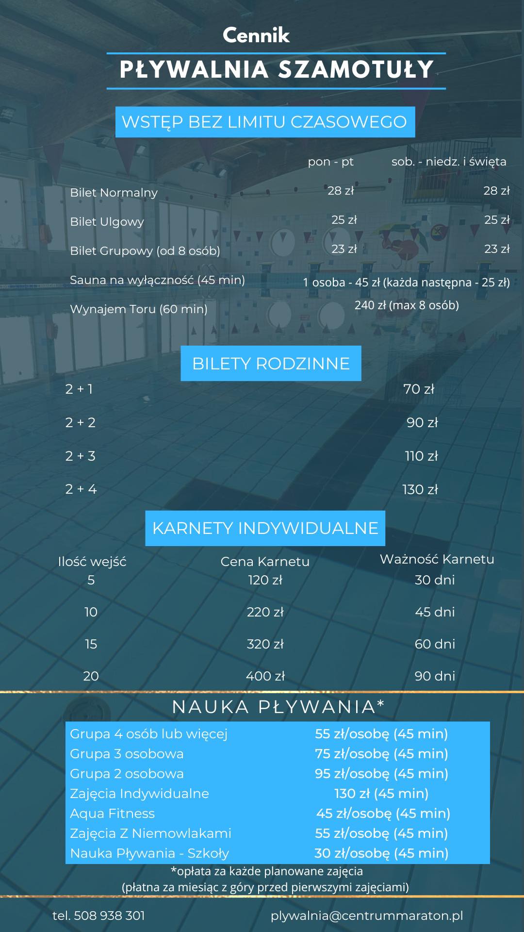 Wzrosły również ceny wynajmu torów, karnetów oraz nauki pływania. Szamotulska pływalnia czynna jest od poniedziałku do piątku w godzinach 7.00 – 22.00. Nowy cennik poniżej.