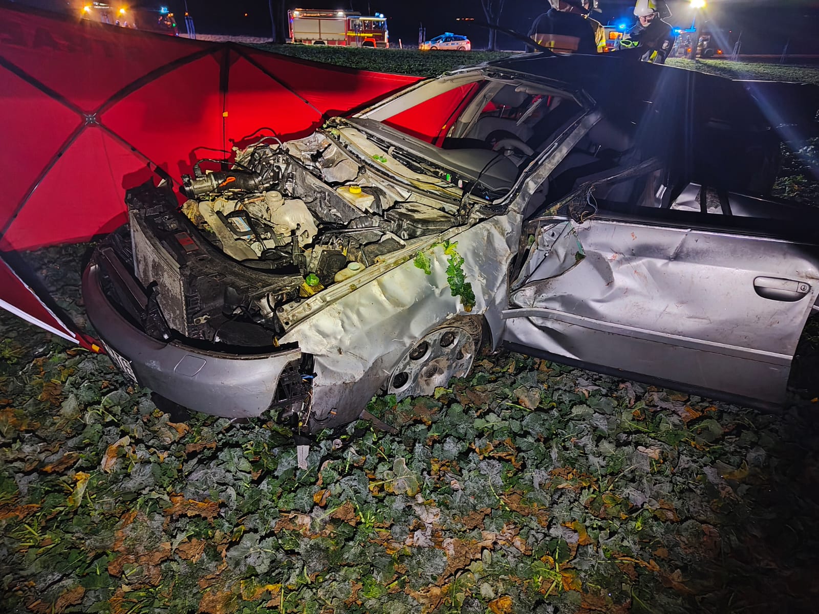 Po dojeździe na miejscu zdarzenia strażacy zastali samochód osobowy marki Audi, który po dachowaniu znajdował się na pobliskim polu. Kierujący i pasażerowie znajdowali się w pobliżu pojazdu – jedna osoba brak funkcji życiowych.