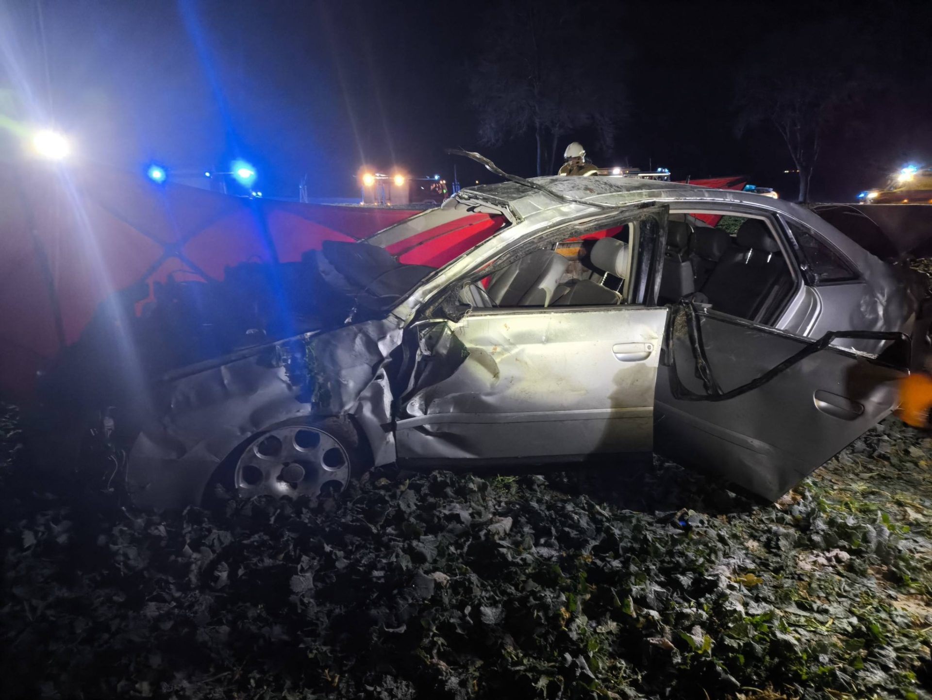 Po dojeździe na miejscu zdarzenia strażacy zastali samochód osobowy marki Audi, który po dachowaniu znajdował się na pobliskim polu. Kierujący i pasażerowie znajdowali się w pobliżu pojazdu – jedna osoba brak funkcji życiowych.
