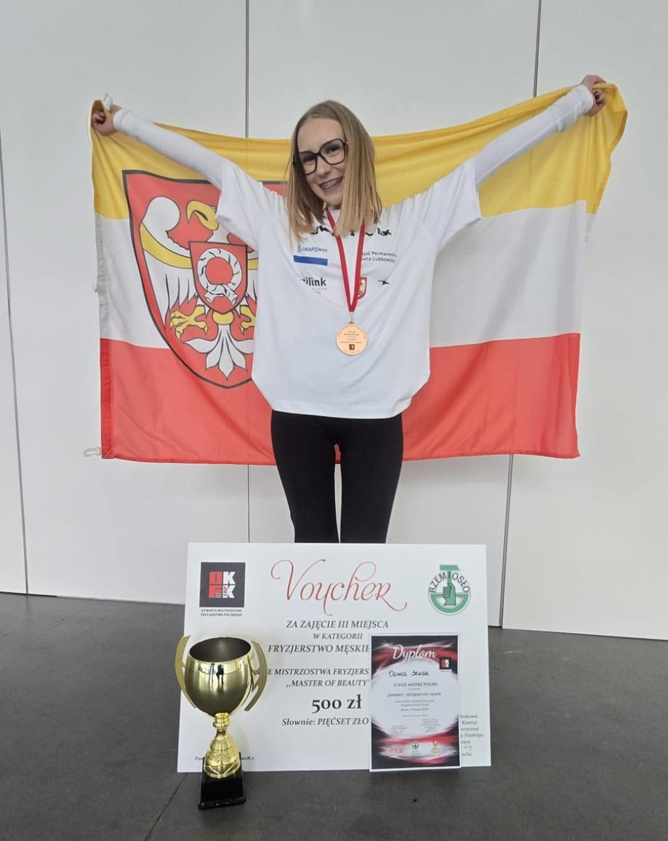 Oliwia Szwak zdobyła III miejsce w kategorii juniorów we fryzjerstwie męskim. To prestiżowe wyróżnienie potwierdza jej wysokie umiejętności oraz profesjonalne przygotowanie do rywalizacji na ogólnopolskim poziomie.