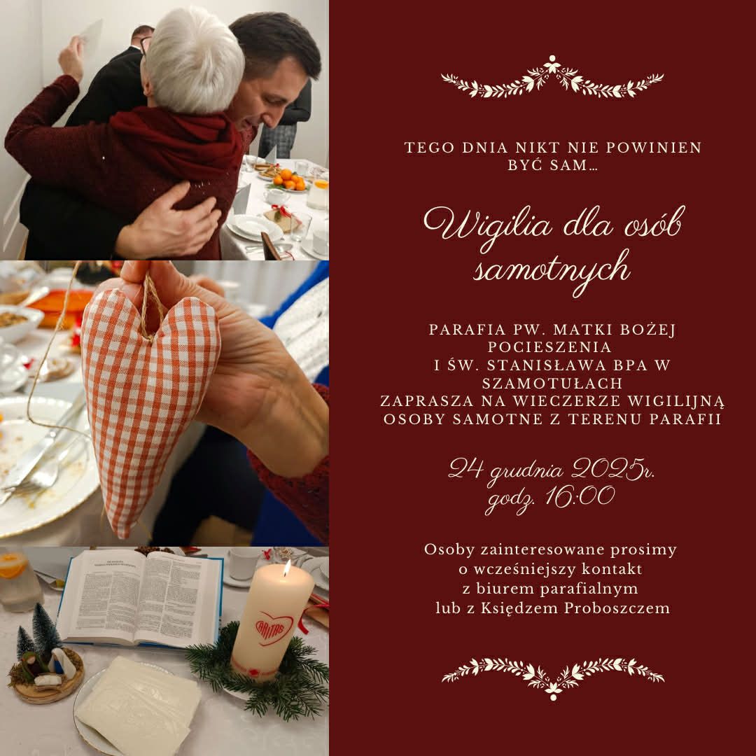 Parafia pw. Matki Bożej Pocieszenia i św. Stanisława Biskupa w Szamotułach organizuje wieczerzę wigilijną dla osób samotnych i ubogich. Spotkanie odbędzie się 24 grudnia 2025 roku o godzinie 16.00 na plebanii bazyliki.