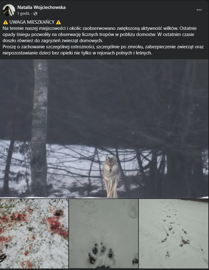 Jak wynika z przekazanych informacji, w ostatnim czasie doszło również do zagryzień zwierząt domowych. To sygnał, który nie powinien być bagatelizowany. Obecność wilków tak blisko terenów zamieszkałych zwiększa ryzyko niebezpiecznych sytuacji, zwłaszcza po zmroku oraz na obrzeżach miejscowości, w pobliżu pól i lasów.